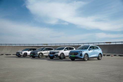 从右至左依次为:魏牌玛奇朵DHT-PHEV、本田CR-V锐·混动e+、比亚迪宋PLUS DM-i、丰田RAV4荣放双擎E+